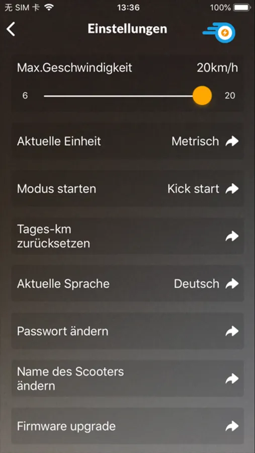 (Hinweis: Die Option "Zero-Start" ist deaktiviert. Der eScooter kann nur mit Kick-Start anfahren. Dies erhöht die Sicherheit des eScooters beim Anfahren.)