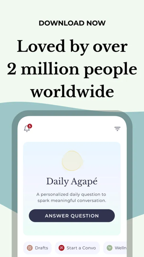 Using Agapé is as easy as answering just one question a day, but with a new person each time. Each question is based on decades of research and chosen specifically for you. Agapé’s questions are fun, exciting, and sometimes even spicey! But don’t worry, we will only send a spicy question if you're matched with your partner.