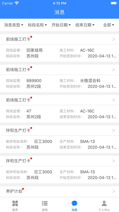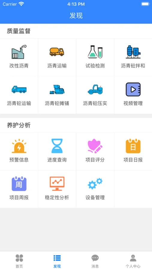 沥青路面养护施工质量信息化管控系统利用互联网技术,实时采集沥青路面养护施工过程数据信息,包括沥青生产、沥青运输、试验检测、混合料拌和、运输、摊铺和碾压等环节,实现养护工程全过程的“数据在线,工艺在线”;通过总体计划、日计划以及各环节打卡等功能,使养护工程各环节工艺紧紧相扣;本系统对养护施工即时监管,即时评价,通过质量分级预警,施工日报,稳定性分析等手段,真实动态的反映养护工程的过程质量情况。