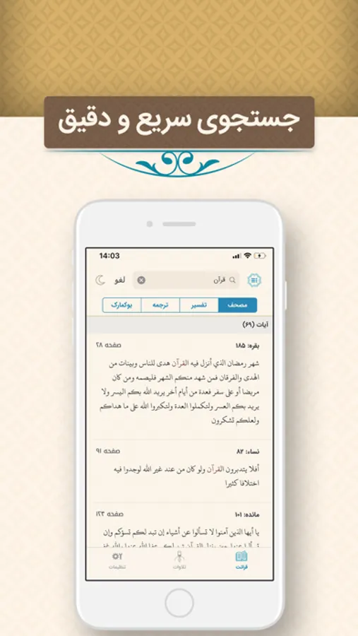 - جستجوی سریع و دقیق در آیات قرآن کریم و نمایش نتایج جستجو به ترتیب سوره و شماره صفحه.