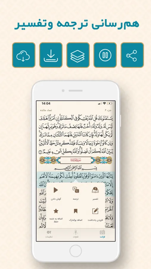 - امکان به اشتراک گذاری آیه به صورت عکس با دیزاین بسیار زیبا.