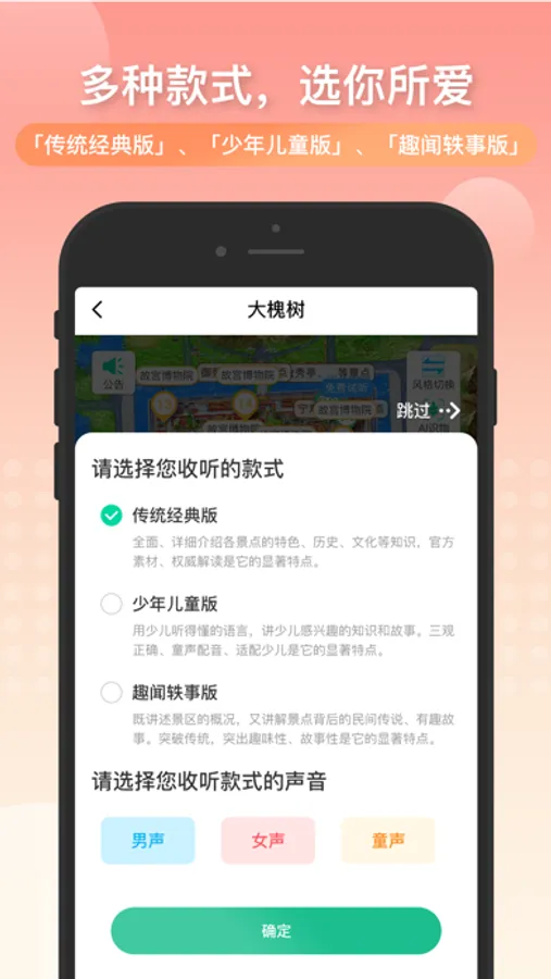 3.真人配音,内容精彩,多种款式,不同声音,带您聆听景点背后的故事,带给您不一样的试听体验