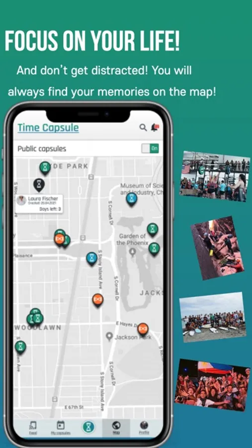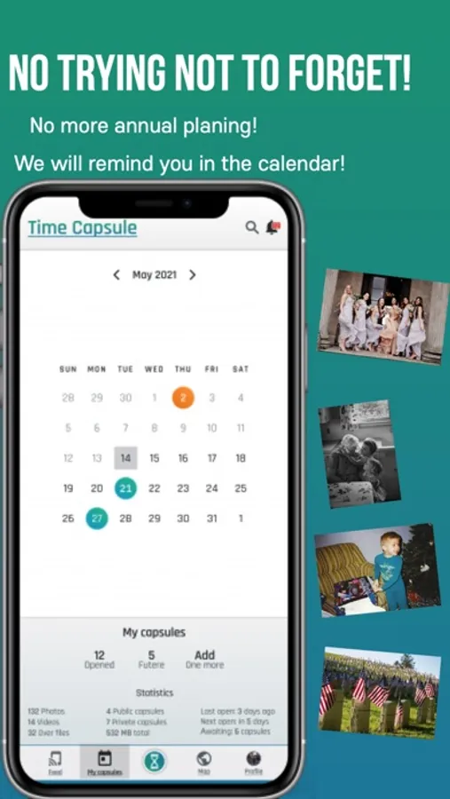 Don’t ways your precious time organizing you photo archive. Focus on your life! Just make your capsule and we will remind you about it in the calendar, show it in your profile and lead you along the map.