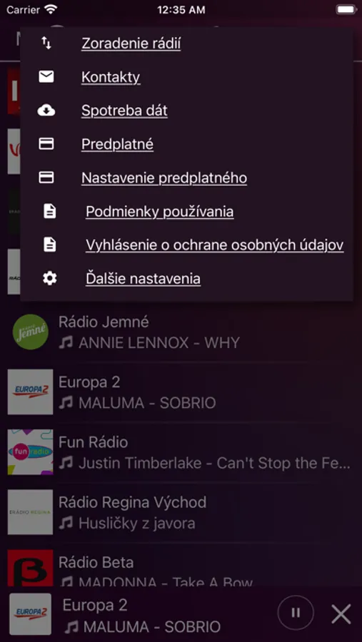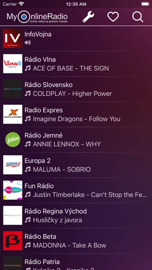 Platená verzia obsahuje aj nahrávanie vysielania, funkciu rozpoznávania skladieb a neobsahuje reklamy. Nižšie nájdeš rádiá dostupné cez našu stránku. Ak nenachádzaš svoje obľúbené rádio, skús ho nájsť pomocou ikony vyhľadávania nachádzajúcej sa v hlavičke aplikácie. Vyhľadávač podporuje aj hlasové vyhľadávanie, ak by si názov nemohol napísať.
