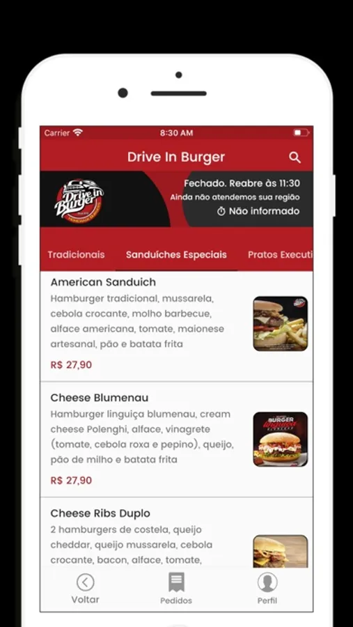 - cardápio ilustrativo, com preços dos produtos;