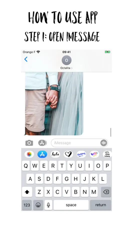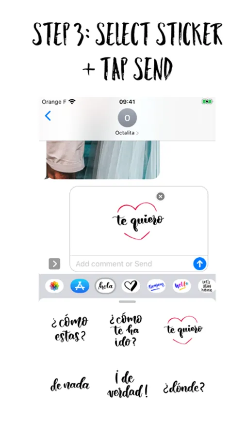 ∙ Tap on the "Hola" Spanish Stickers for iMessage app icon (just below the chat box)