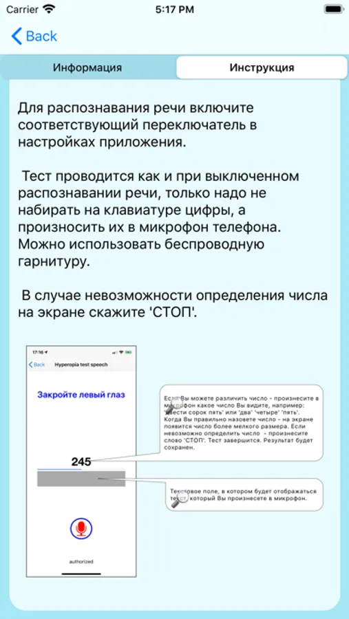 The application will help to checkyour vision near andin a distanceon a scale from 0 to 1. Also according to the saved results, you can control the changes of your vision.
