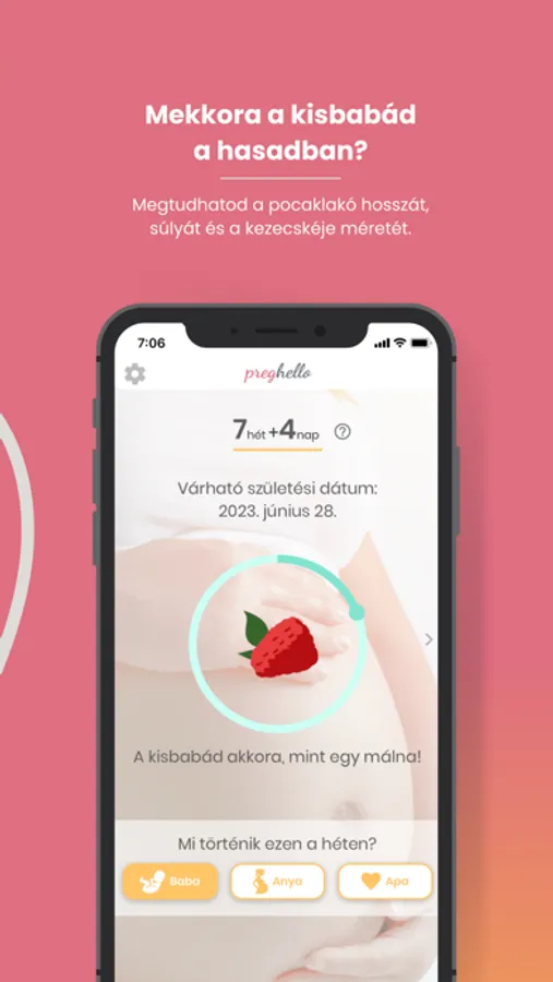Az aktuális terhességi hetedről a kezdőképernyőn találsz számszerűsített információt. Itt megtudhatod, hogy hány nap van még hátra a babád érkezéséig, mekkora lehet a pocaklakód hossza és súlya . Ezeket az információkat a megosztás gomb segítségével egy koppintással mind megoszthatod szeretteiddel.