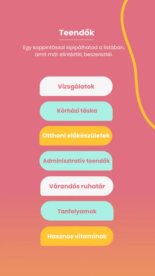 A teendők menüpontban, listákat találsz a beszerzendő és elintézendő dolgokról. Ezek közül amiket már elintéztél, egy koppintéssal kipipálhatsz.