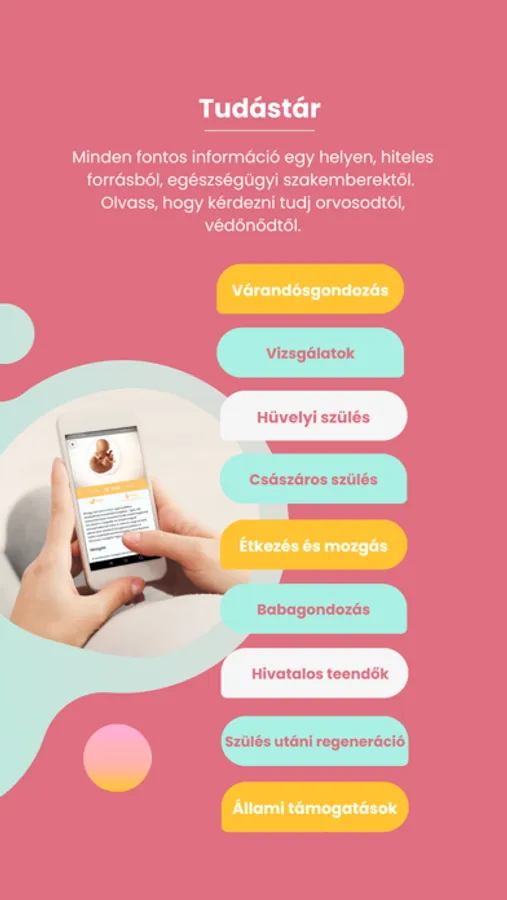 Összegyűjtöttük a babavárással kapcsolatos összes fontos tudnivalót és ezeket egy rendszerben, átláthatóan és remélhetőleg érthető formában osztjuk meg a várandós anyukákkal. Az alkalmazás kiszámítja a szülés várható időpontját az általad megadott információk alapján, így követheted hétről hétre a terhességed és a kisbabád fejlődését.