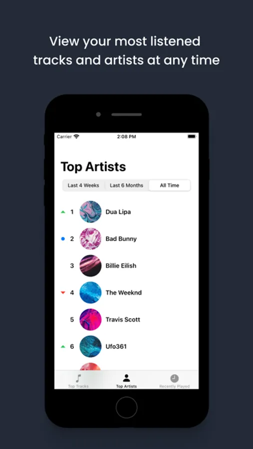 See top tracks and top artists for both Spotify basic and Spotify premium accounts. See the most listened songs/artists for the last 4 weeks, 6 Months, and All Time. The app keeps the top 50 most played tracks and artists for each period.