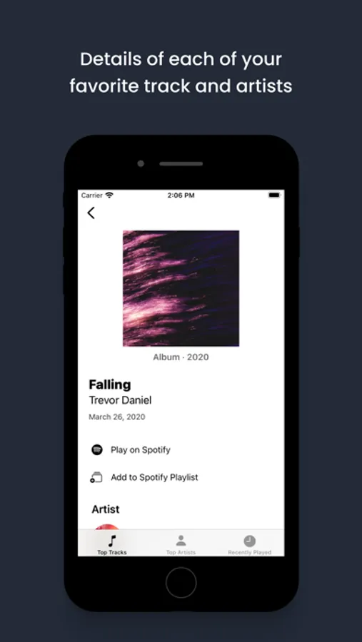 Tap the artist or song name to get more details about a track or artist. Then view artists or listen to a track directly in Spotify just with a single tap.