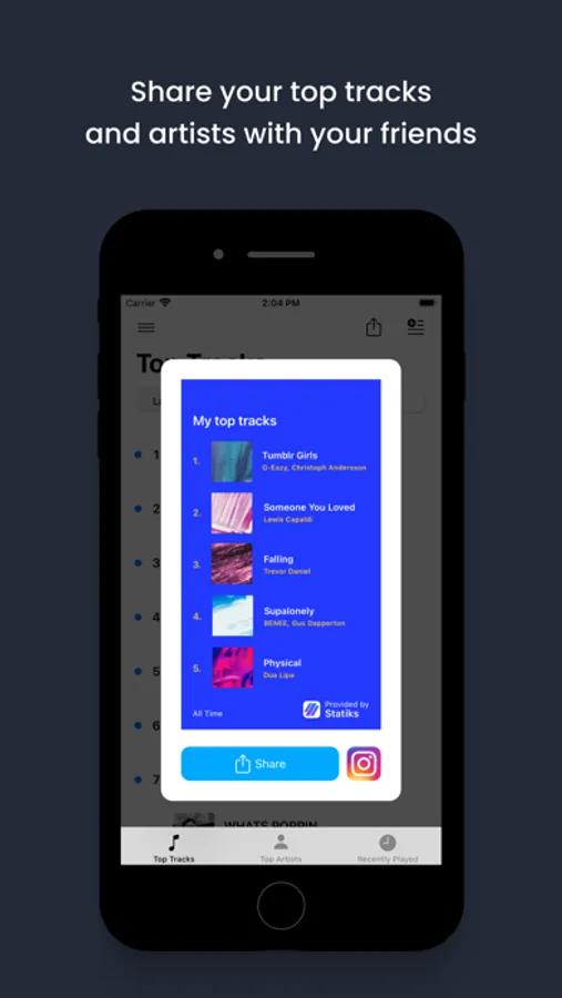 Share your top tracks and artists with your friends. Our app creates images for you which can easily be shared on many social media and messaging apps. Showing your friends your favorite songs or artists has never been that great.
