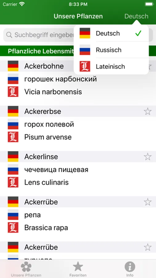 Die App bietet eine schnelle Suche nach Begriffen in einer Sprache und gibt die exakte Übersetzung in zwei anderen Sprachen zurück. Jede Pflanze ist mit einer Google-Suche verknüpft um schnell noch mehr Informationen zu bekommen. Die Pflanzen können einfach zu Ihren Favoriten hinzugefügt werden, so dass Sie immer schnellen Zugriff darauf haben. Das Lexikon ist einfach aufgebaut und daher sehr benutzerfreundlich. Die App bietet zudem Unterstützung des Dunkelmodus (Dark Mode).