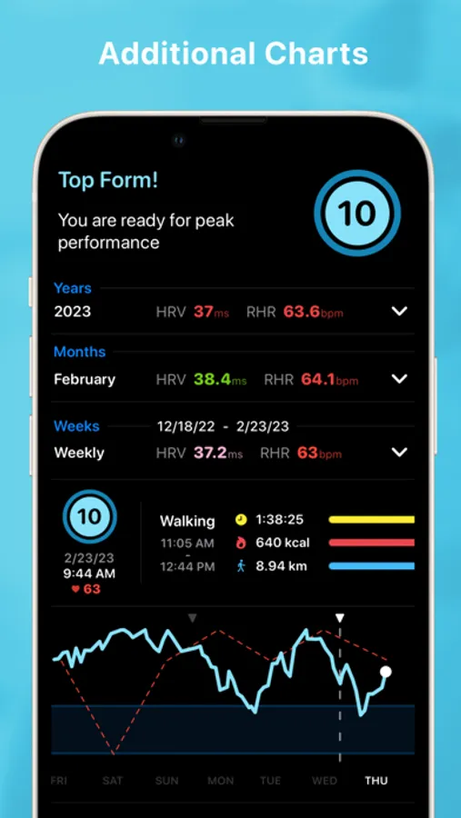 * View your complete baseline HRV and RHR (Resting Heart Rate) data in the iPhone app and scroll through Years, Months and the related weekly RTT charts.