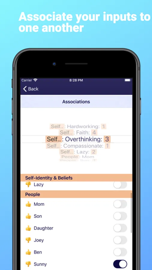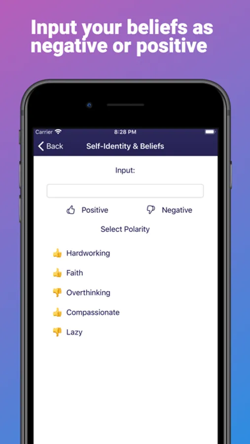 Objective: You will simply keep inputting your various beliefs, people, places and events that influence your life one way or the other.. assign them a polarity of positive (happy or good ones) or negative (sad or bad ones), and you will be able to see which patterns you are subject to.