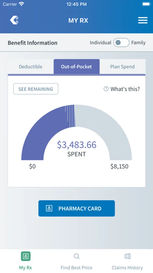 • Graphical view of Deductible, Out-of-pocket, and Plan spend for individual and family