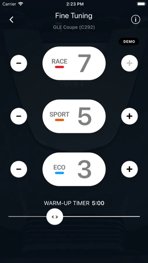 Experience the tuning effect in its most innovative form yet – more power for your car with the tuning module. Fine tune the respective settings to perfectly match your car's specifics and your personal driving style. Map these settings to three easy to the access driving modes Eco, Sport and Race.