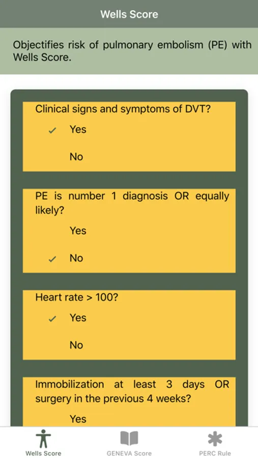 "Pulmonary Embolism Score: Wells, GENEVA, PERC rule" is a mobile app designed to help health practitioner to determine the risk of pulmonary embolism by using the Wells criteria or Wells score, GENEVA score, and PERC rule. The Wells criteria for pulmonary embolism is a risk stratification score and clinical decision rule to estimate the probability for acute pulmonary embolism in patients in which history and examination suggest acute pulmonary embolism is a diagnostic possibility. As with all clinical decision aids, the physician must first have a suspicion of the diagnosis before attempting to apply the Wells criteria. History taking and exam should always be performed prior to using the "Pulmonary Embolism Score: Wells, GENEVA, PERC rule" app.