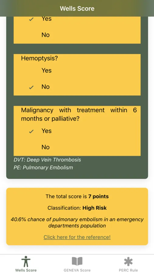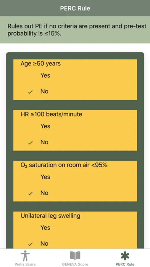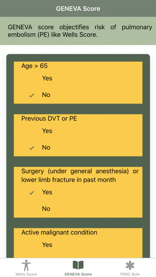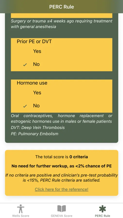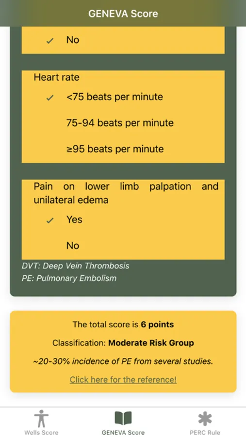 Disclaimer: All calculations must be re-checked and should not be used alone to guide patient care, nor should they substitute for clinical judgment. Calculations in this "Pulmonary Embolism Score: Wells, GENEVA, PERC rule" app might be different from your local practice. Consult with an expert doctor whenever necessary.