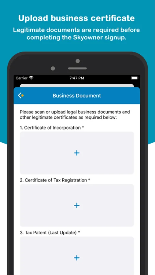 Before creating Skyowner, please making sure that you are business owner and have legitimate business certificate, patent which are legally registered by Ministry of Commerce.