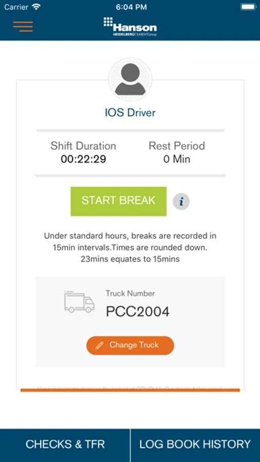 This application is used by Hanson Australia Drivers to create/manage TFR's, Manage fatigue breaks, and electronic vehicle checks. This application is setup to help manage the rest breaks of drivers as per Australian Law.
