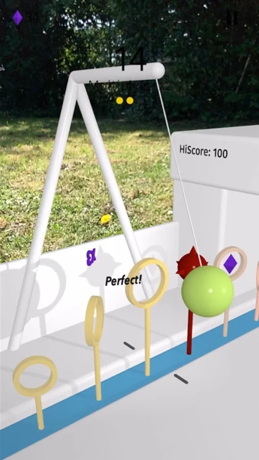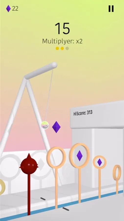 Enjoy the calming motion of the swinging ball as you embark on your journey through a chain of hoops, spikes and more.