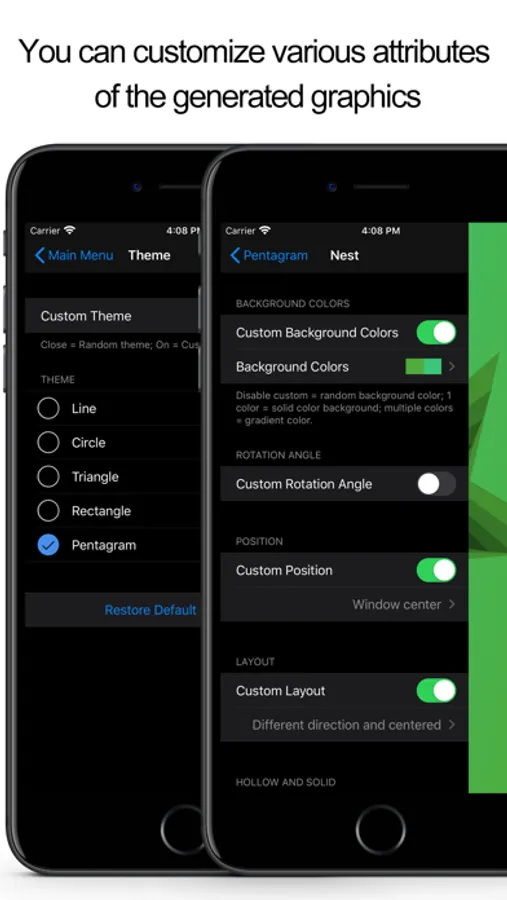 2. In the custom mode, you can control the theme, style, background color, rotation angle, etc. of the generated geometric graphics, and set various detailed parameters of different graphics.