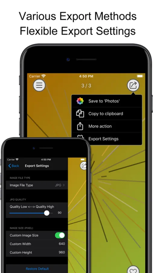 6. You can export the geometry as a picture, save it to the system "Photos", save it to the specified directory, copy it to the clipboard, share it with friends, etc. You can set various sizes of exported pictures (various common sizes, or custom width/height), pictures in multiple formats (such as JPG/PNG/BMP/TIFF, etc.), and so on.