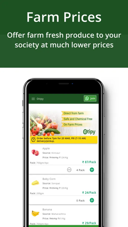 Looking for aspiring entrepreneurs who want to own a digital business and deliver fresh farm produce and daily essentials at best prices to their community. Own your digital store with Otipy partner program and earn an average income of Rs. 3 lakh/year. Our partners receive early morning packages and facilitate super-fast delivery of fresh fruits & vegetables, groceries and dairy products to the consumers. Start earning from the first day, with minimum investment.