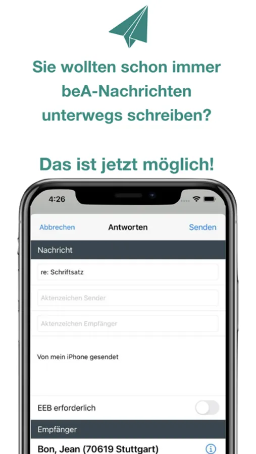 Sie können beA-Nachrichten mobil empfangen, versenden, beantworten, als Entwurf einlesen (und ggf. verschicken), exportieren sowie eEBs abgeben/ablehnen.