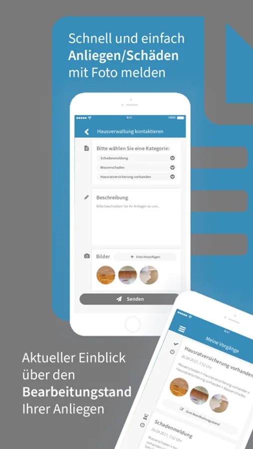Als Mieter oder Eigentümer können Sie Schäden oder Anliegen direkt mit Fotos über unsere App melden. Ihre Anfragen stehen unseren Mitarbeiten dann zur Verfügung und können auch an Handwerksbetriebe weitergeleitet werden.