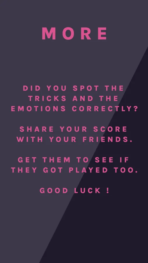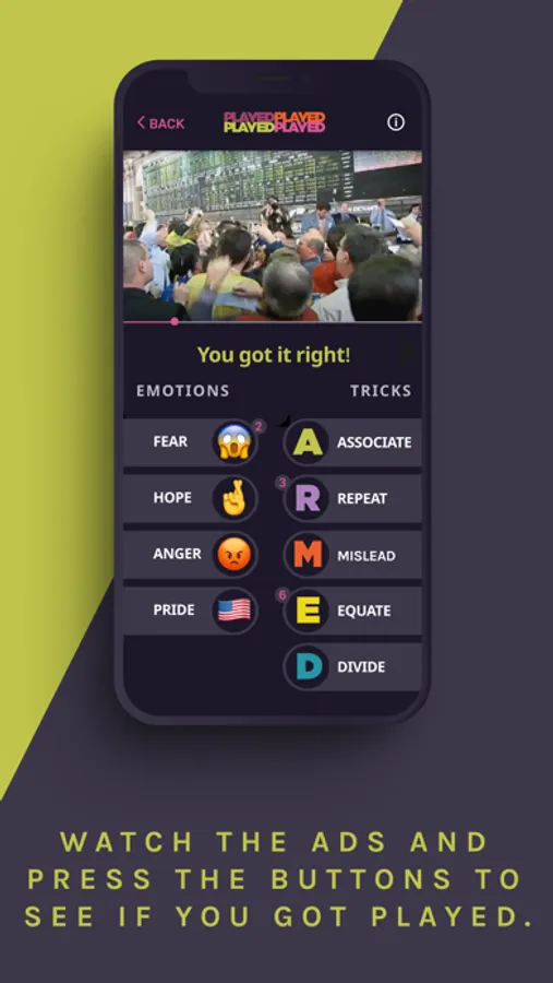 Using current and historical ads, you feel fear, anger, hope, and pride while you learn 5 tricks political ads use to manipulate your emotions and win your support. Play this app like a video game, check your score, and see for yourself if you get played. The goal: Do vote, but don’t get played!