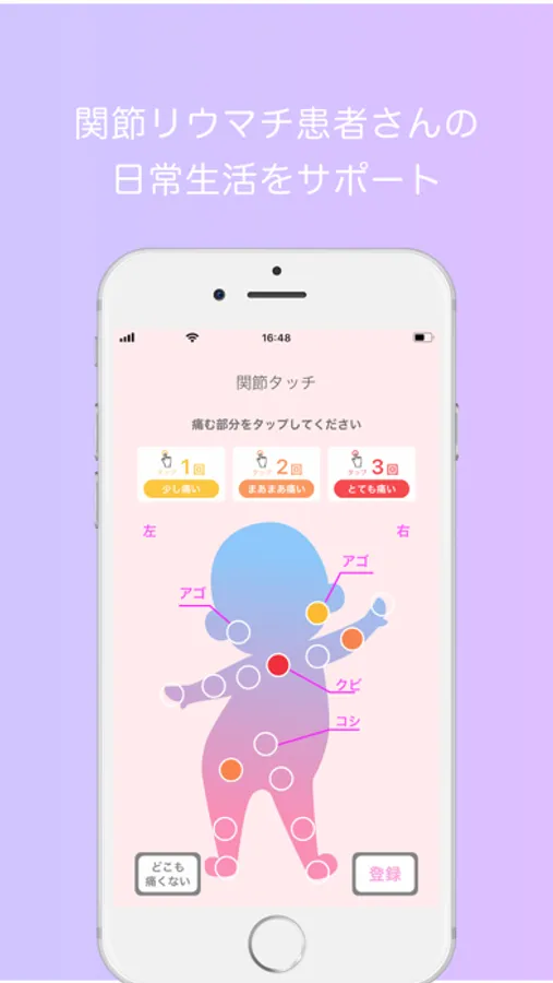 従来から、関節リウマチの痛みや体調は天候に影響されやすいと言われていますが、実際に日々の天候や運動などの生活習慣が痛みや体調にどのように関連しているかについては、まだ明らかになっていません。本アプリでは、利用者の日々の体調、痛み、こわばり等に加えて、その日の天候や、前日の歩行数などを記録。収集したデータからその関連を明らかにすることを目指しています。