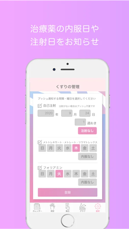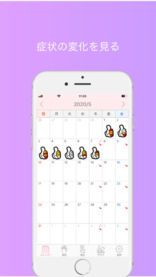 その日の体調や痛み、こわばりなどをアプリに入力することで、日々の症状を把握することに役立てます。また、治療薬の内服や注射を続けるうえで飲み忘れなどが生じないように、カレンダーやお知らせ機能を備えたアプリにすることで、関節リウマチ患者さんの日常生活をサポートしていきます。