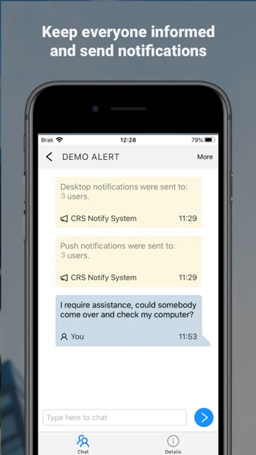 The CRS Notify Panic Button Mobile App turns your phone into a personal panic button which allows you to get help fast from the people around you and from first responders. The CRS Notify Panic Button Mobile App also allows you to notify people in multiple ways and communicate throughout the alert event.