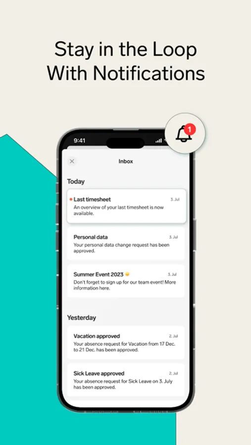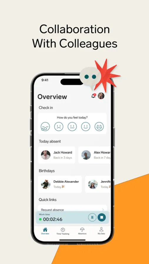 • Stay Up to Date: Your home screen shows you your teammates’ birthdays and lets you know who’s out of office. Notifications show you when your absences, timesheets, and data changes have been approved.