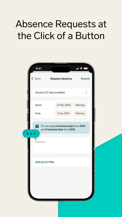 • Request Absences Anywhere: Check your remaining vacation balance, see which colleagues are absent, and request vacation or sick leave, no matter where you are.