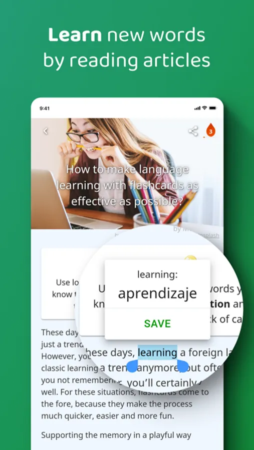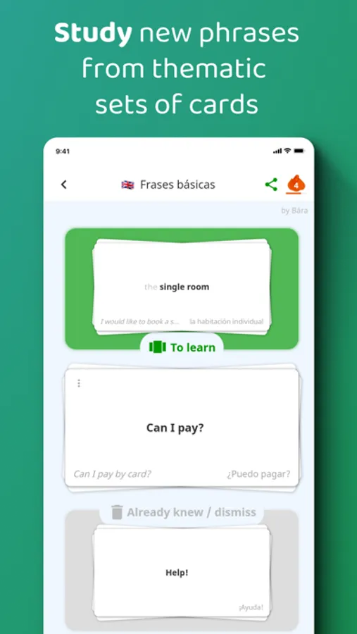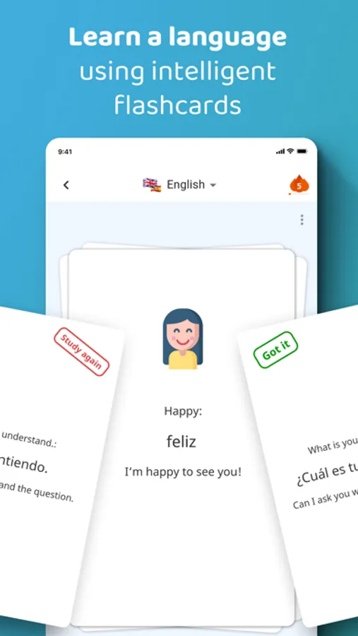 Tap on the flashcards to turn it on your native language side. You will swipe them right if you guess the meaning correctly and swipe left on the words you do not know.