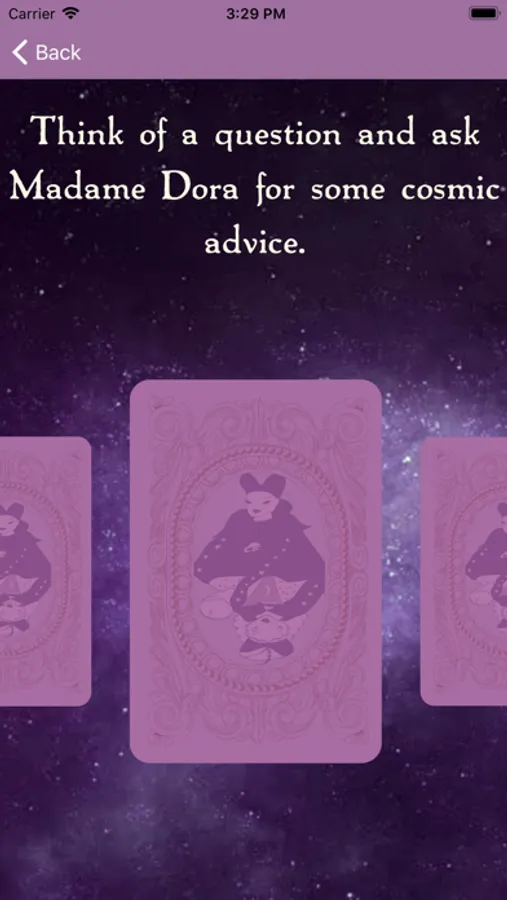 The 50 cards are arranged so that you can ask your question, pick a card and let both the universe of chance and Madame Dora’s spiritual intuition guide you to a better, positive place.