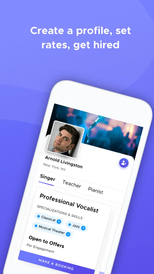 • Show off your skills as a multifaceted artist: get paid hourly as a teacher or per gig as a performer, all with the same profile.