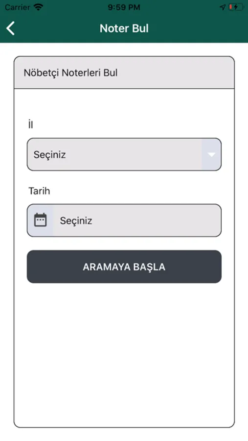 Noter Bul uygulamasıyla farklı kriterlerde noterleri uygulama içerisinde aratabilir ve detaylarını bulabilirsiniz. İlgili Noter’in telefonunu aramak veya Noter’e ulaşmak navigasyona tek tuşla yönlendirilebilirsiniz. Ayrıca size en yakın Noter’i bulabilir, bu Noter’e yol tarifi alabilir, telefonla arama yapabilmeniz için uygulama üzerinden aramaya yönlendirilebilirsiniz. Uygulama il ve tarih bilgisiyle size nöbetçi noterleri göstermenizi sağlar. Benzer şekilde bu Noter’e yol tarifi alabilir, telefonla arama yapabilmeniz için uygulama üzerinden aramaya yönlendirilebilirsiniz
