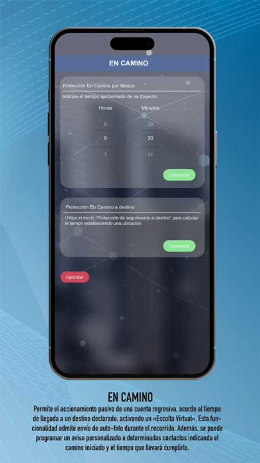 - Guardian virtual que te acompaña de un lugar a otro con control de recorrido y tiempo (EN CAMINO) y reporta a tu grupo de usuarios