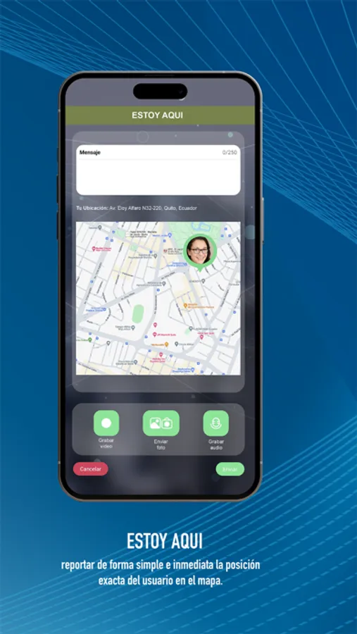 La aplicación dispone de botones de pánico inmediatos con envio de ubicación geográfica, sonido e imágenes por fotos y clips de video del lugar donde sufras tu emergencia