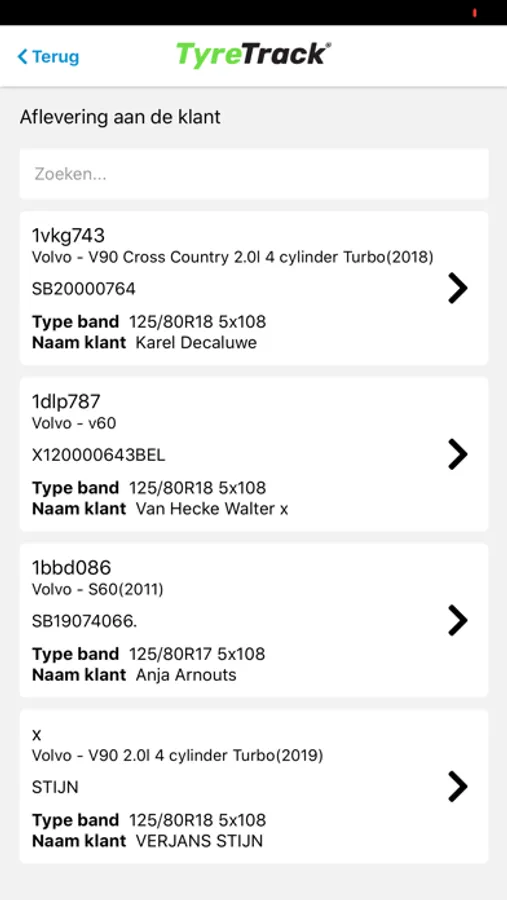 Registratie van specifieke kenmerken van de band (merk, maten, voor welk type auto, etc.)