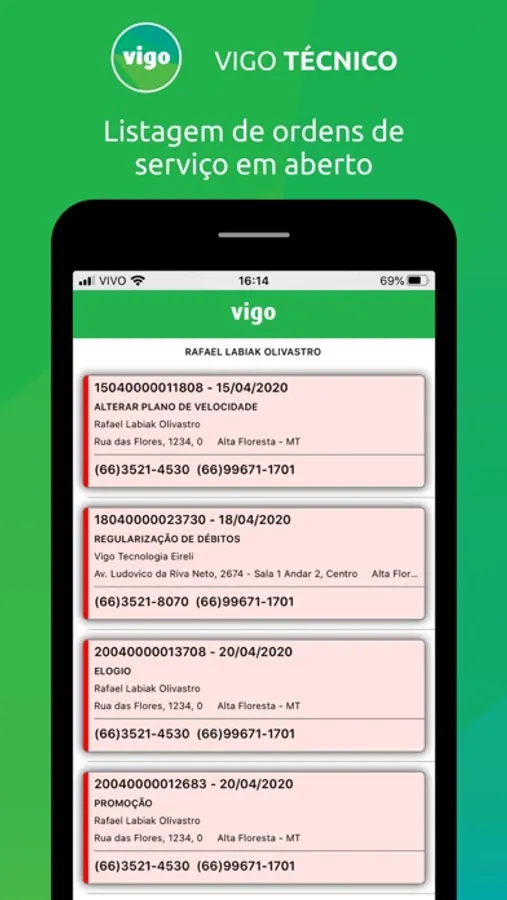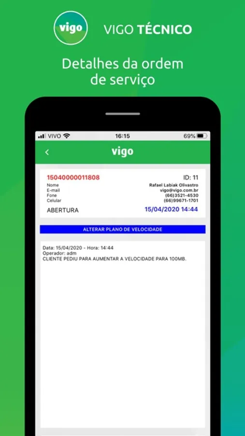 Aplicativo para o técnico do provedor de internet, integrado ao Sistema VigoWEB, permitindo que o mesmo gerencie as ordens de serviços de sua responsabilidade, podendo efetuar as seguintes ações: