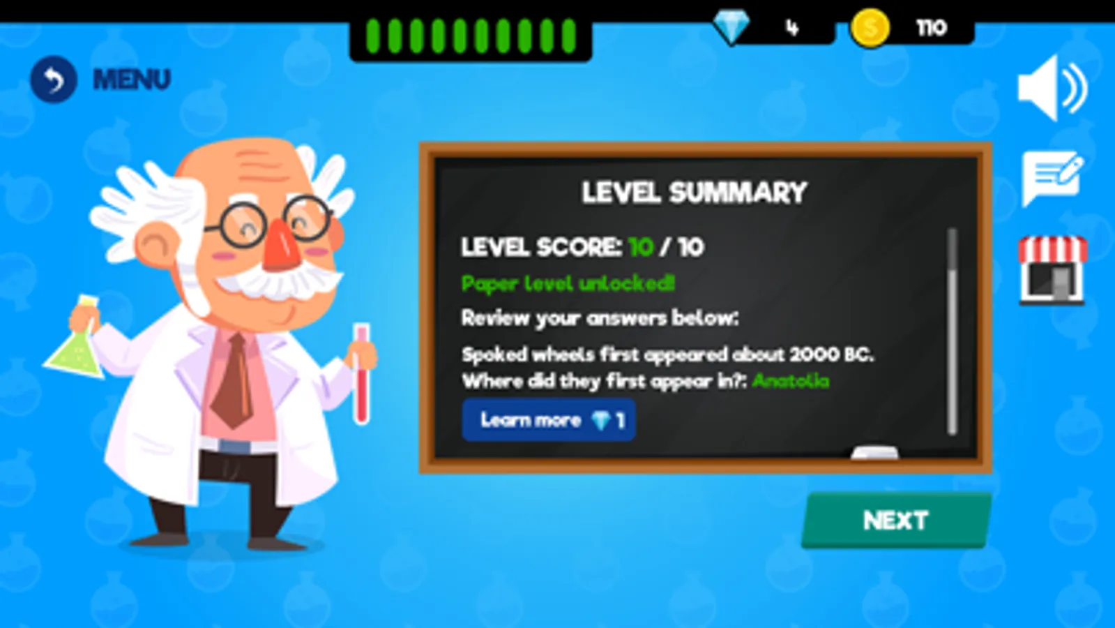 ◆ LEVEL SUMMARY ◆ where you can review your answers, reveal correct ones and learn more!