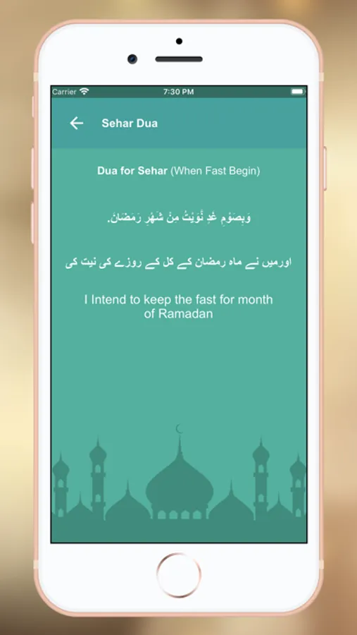 - Sehar Dua: Get notification about Sehar time and sehar dua. Recite dua for sheri: “Wa bissawmi ghadann nawaitu min shahri Ramadan”. Translation: "I Intend to keep the fast for month of Ramadan". May ALLAH Subhanahu Wa Ta'Ala bless you with more rewards and forgive your sins.