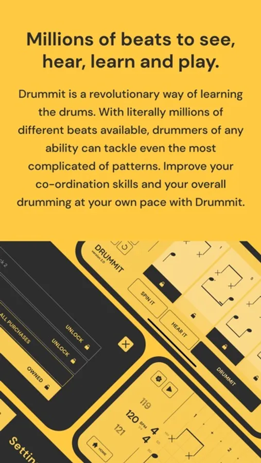 Drummit is a revolutionary way of learning the drums. With literally millions of different beats available, drummers of any ability can tackle even the most complicated of patterns. Improve your co-ordination skills and your overall drumming at your own pace with Drummit.