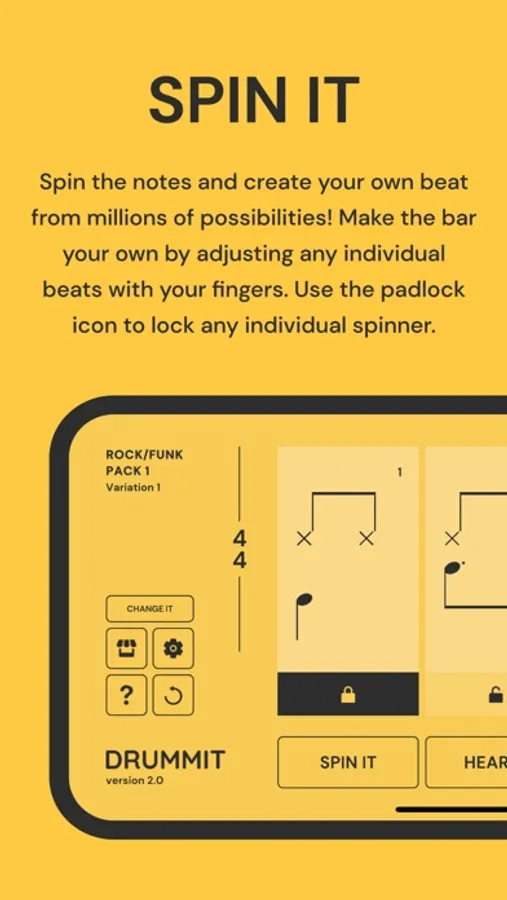 SPIN IT: Tap here to spin the notes and create your own beat from millions of possibilities! Make the bar your own by adjusting any individual beats with your fingers. Use the padlock icon to lock any individual spinner.